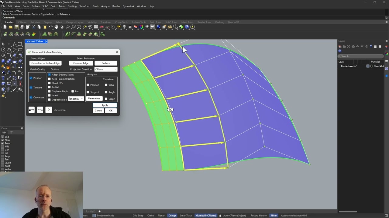 Xnurbs ti permette di lavorare più velocemente e di passare da una “Patch” o di fare una quadsurface di classe A molto più facilmente e al livello di apprendimento di utilizzo è più semplice a mio avviso, ma se per motivi economici adesso non puoi utilizzare Xnurbs, al momento gli utenti di Rhino 8 possono scaricare Rhino9/ wip dove attualmente ci sta il comando FillSrf che sostituisce Xnurbs, tra l’altro vatti a vedere l’ultima mia risposta all’interno del topic dove mostro l’utilizzo di FillSrf in un video dove c’era l’Audi, Rhino 9 Feature : G2 continuous patches - #191 by Charles - Serengeti (Rhino WIP) - McNeel Forum anche se li ho fatto presente un Bug, ma è cosa da poco. Il comando Fillsrf attualmente per chi non ha Xnurbs è un ottima alternativa.