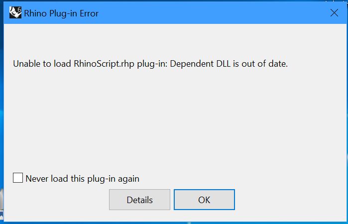 Quando apro Rhino 6 facendo doppio click su un file .3dm mi appare un errore di caricamento del plugin RhinoScript a causa di una DLL scaduta.